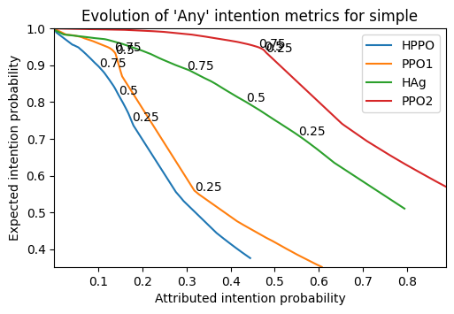 - Attributed Intention Probability: What is the probability that, at some point during execution, I am in a state that could answer explainability questions (regarding intention)? Ie. what is the probability that the state any (ie. at least one) intention above the commitment threshold? At lower thresholds, there is more attributed intention probability, we can ask more often, and the behaviour is more interpretable (even if the interpretation is incorrect).