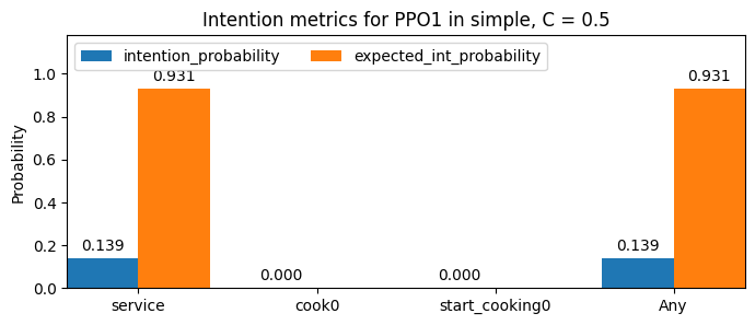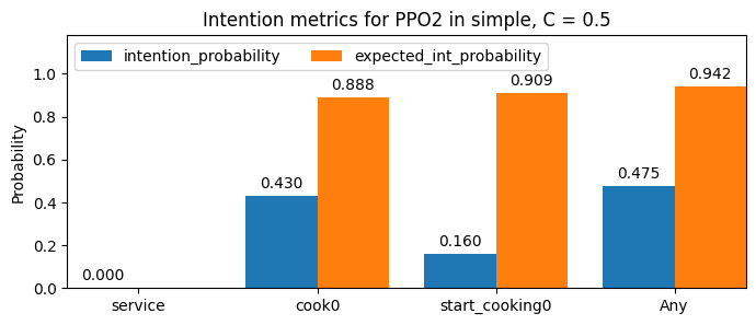 - Expected Intention Probability: What is the probability that, once an intention is attributed to the agent, that it will be fulfilled? Note that, since intention is already that probability, what we are effectively computing is the expected intention value. At higher commitment thresholds, there will be less lower-intention states with attributed intention and hence higher expected intention; which translates in explanations being more often correct in what the agent will do.