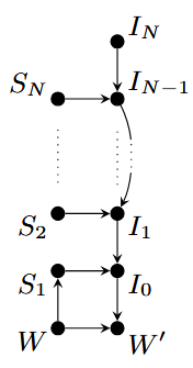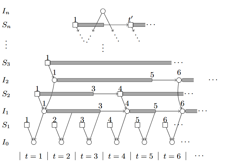 This is the rule we use to split the causal trace of action-taking homogeneously between architectures: percepts belong in the first rung of the ladder, and any statement reifying or including a statement of level i belongs at least to level i+1. Each of these levels are named Si. We associate each level with the imperative code that uses it: Ii(Si). The final imperative code is action execution. Each imperative code is ‘generated’ or at least ‘modified’ by other imperative codes, for example: