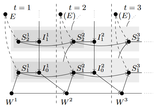 In this model, we introduce this form of causality in an informal way: the set of variables S and I of the inferior rung of the ladder are ‘compiled’ into a statement of the current level by an algorithm (which we named E from Epistemic). This implies that E is whatever algorithms were used to create the Q-function from rewards, process and write the feedback for Voyager, etc. Similarly, it would be the curriculum or ‘updater’ of the epsilon parameter in Q-learning. All of these are statements that ‘make sense’ to be updated from inferior levels (Q-learning being updated with reward and experience from state-action trajectories, feedback being compiled by locating the unexpectedness of states and the error logs, or decaying epsilon given that the Q-function appears to be converging to a useful exploiter).
