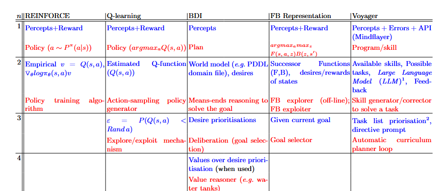 Following this logic, we can take a variety of architectures and cast them into the framework, from Q-learning and REINFORCE (traditional RL techniques), purely symbolic BDI agents, LLM-based Voyager, or even approximations from zero-shot RL like Touati’s Forward-Backward representation (from his paper ‘Does Zero-Shot RL exist?’).